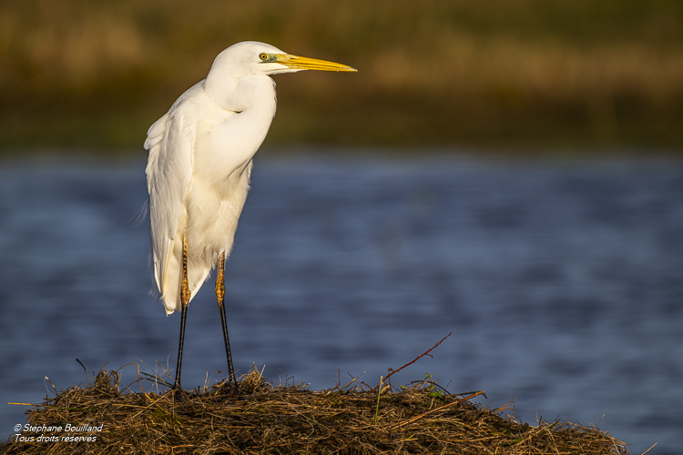 En cette matinée ensoleillée de mi-avril deux Grandes aigrettes sont en pleine parade nuptiale au cœur de la héronnière au sommet des grands pins laricios du Parc du Marquenterre. On se croirait au Moulin rouge ou dans une scène du Roi Soleil. Comme de la dentelle les plumes du dos sont ébouriffées chez les deux oiseaux offrant un feu d’artifice blanc aux voisins de palier que les sont les cigognes, spatules et autres hérons garde-bœufs. Et aux visiteurs humains du Parc depuis le poste d’observation public !.En ces moments de séduction les adultes ont aussi le bec noir (jaune pour les oiseaux immatures et hors  saison de nidification). Les lores verts autour des yeux sont un subtil maquillage du plus bel effet !